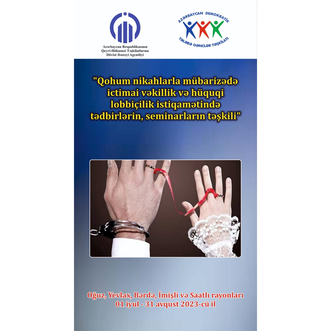 “Аzərbaycan Demokratik Tələbə Gənclər Təşkilatı” İctimai Birliyi Azərbaycan Respublikasının Qeyri-Hökumət Təşkilatlarına Dövlət Dəstəyi Agentliyinin maliyyə dəstəyi ilə "Qohum nikahlarla mübarizədə ictimai vəkillik və hüquqi lobbiçilik istiqamətində tədbirlərin, seminarların təşkili" adlı araşdırma, maarifləndirmə, PR və sosial fəaliyyətli layihənin icrasına başlayıb. Bu haqda ADTGT İctimai əlaqələr və informasiya departamentindən saytımıza məlumat verilib.