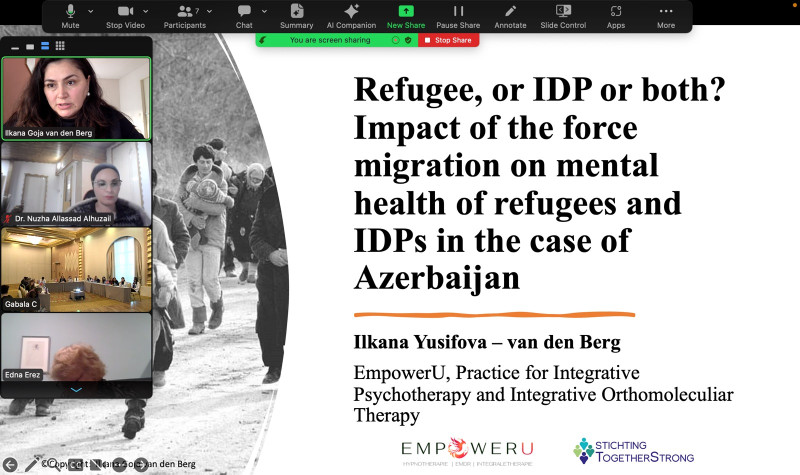 İnteqrativ psixososial terapevt və alternativ tibb üzrə mütəxəssis İlkanə Qoca van den Berq konfransdakı təqdimatında son illərdə əldə etdiyi kliniki təcrübəyə əsaslanaraq "Qaçqın, məcburi köçkün, ya da hər ikisi? Azərbaycanın məsələsində məcburi miqrasiyaya məruz qalmış qaçqın və məcburi köçkünlərin psixoloji sağlamlığı" mövzusundakı araşdırmasının nəticələrini təqdim edib.