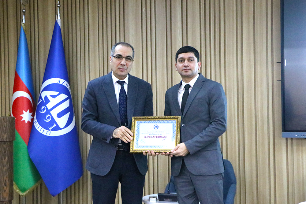 Kafedranın müdiri, siyasi elmlər üzrə fəlsəfə doktoru, dosent Elvin Talışınskiyə “İlin kafedrası” sertifikatını Elmi işlər üzrə prorektor Yusif Qasımov təqdim edib.
