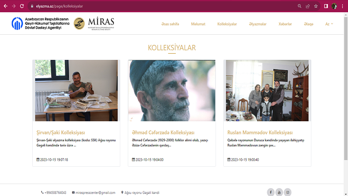 Azərbaycan Milli Elmlər Akademiyasının Əlyazmalar İnstitutunda saxlanılmayan əlyazmaların kolleksiyaları "Miras" Mədəni İrsin Öyrənilməsinə Kömək İctimai Birliyinin Azərbaycan Respublikasının Qeyri-Hökumət Təşkilatlarına Dövlət Dəstəyi Agentliyinin maliyyələşdirdiyi "Dünya yaddaşı - əlyazma kolleksiyalarının virtual təqdimatının təşkili, kataloqların hazırlanması" layihəsi çərçivəsində geniş ictimaiyyətə virtual təqdim olunur. Əvvəlcə Şirvan-Şəki əlyazma kolleksiyası, “Lahıc” Dövlət Tarix-Mədəniyyət Qoruğu əlyazma kolleksiyası, “Basqal” Dövlət Tarix-Mədəniyyət Qoruğu əlyazma kolleksiyası, Ruslan Məmmədovun əlyazma kolleksiyası, Əhməd Cəfərzadənin əlyazma kolleksiyası, Ağsu rayonu Külüllü kəndi Bilal əfəndi məscidi əlyazma kolleksiyası və Kürdəmir rayonu Şahsevən kəndi Ağ günbəz əlyazma kolleksiyası layihəyə cəlb edilib. Onların içərisindən əlli əlyazma seçilərək onlayn kataloq və elyazma.az internet səhifəsi üçün öyrənilib. Virtual təqdimatı təşkil etmək üçün "Miras" Mədəni İrsin Öyrənilməsinə Kömək İctimai Birliyi elyazma.az domenini alıb, internet səhifəni və onun məlumat bazasının yaradılmasını həyata keçirib. Elyazma.az səhifəsi IMAGE MMC tərəfindən dizayn olunub və məlumat bazası üçün forma hazırlanıb. Mütəxəssislər öyrəndikləri əlyazmaları vaxtaşırı bazaya yerləşdirirlər. Əsas səhifədə qeyd olunub ki, əlyazmalardan istifadə etmək üçün əvvəlcə [email protected] məktub yazılsın və məktuba istək forması əlavə olunsun. Bu ifadədən məqsəd oxucuların, əlyazma həvəskarlarının, dövlət qurumlarının əlyazmaların pdf. variantını əldə etmək üçün əlçatanlığı təmin etməkdir.