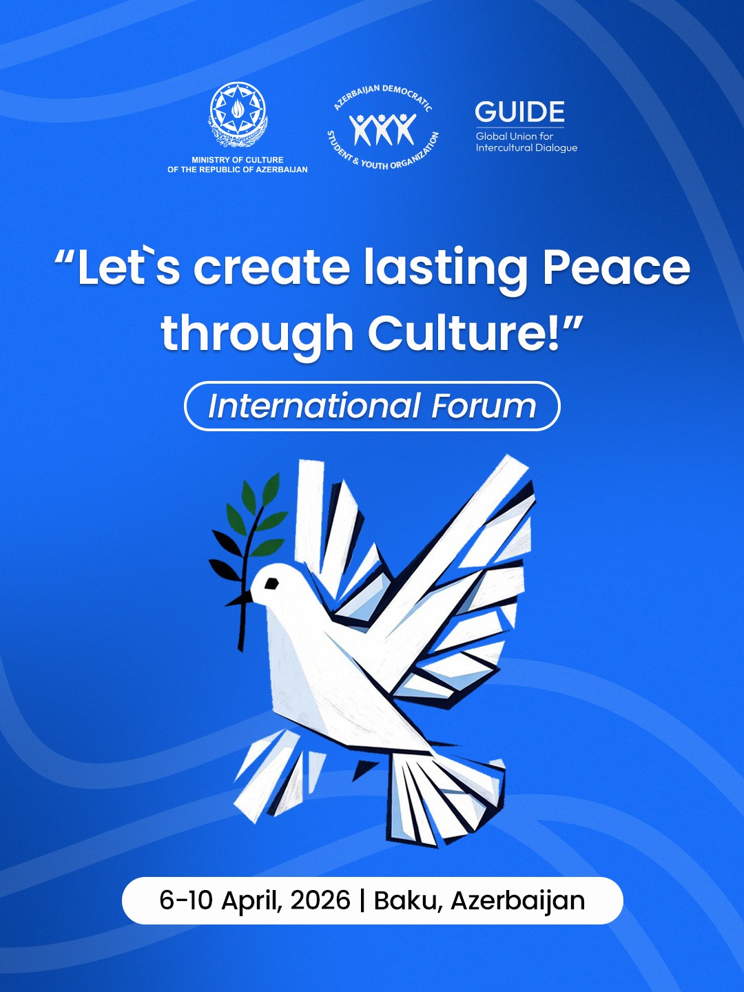 Təhsil, maarifçilik, gənclərin mədəni və sosial inkişafı sahəsində fəaliyyət göstərən “Аzərbaycan Demokratik Tələbə Gənclər Təşkilatı” İctimai Birliyi (ADTGT) Azərbaycan Respublikası Mədəniyyət Nazirliyinin maliyyə dəstəyi və Mədəniyyətlərarası Dialoq Naminə Qlobal İttifaqın tərəfdaşlığı ilə ölkəmizin sivilizasiyalar və mədəniyyətlərarası dialoq siyasətinin təbliği məqsədilə “Mədəniyyət Vasitəsilə Davamlı Sülh Yaradaq!” Beynəlxalq Forum adlı layihə icra etməyə başlamışdır.