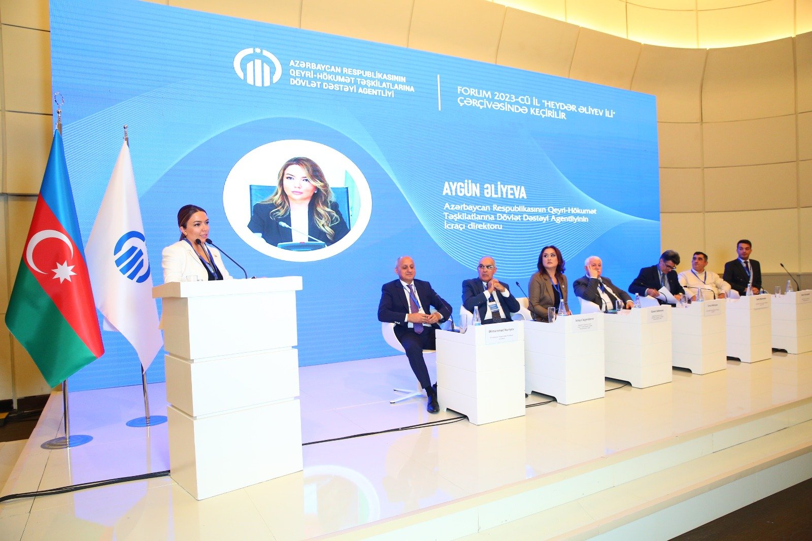 Heydər Əliyev Mərkəzində təşkil edilən forumda çıxış edən Agentliyinin icraçı direktoru Aygün Əliyeva tədbirin Zəfər bayramı və Bayraq günü ərəfəsində keçirilməsinin xüsusi əhəmiyyətini qeyd edib, vətəndaş cəmiyyətinin inkişafında Ulu Öndər Heydər Əliyevin misilsiz xidmətlərindən, Azərbaycanın yeni inkişaf mərhələsində qeyri-hökumət təşkilatlarının rolundan bəhs edib. O, bir neçə gündən sonra – noyabrın 10-dan etibarən Agentliyin 2024-cü il üzrə qrant müsabiqələri üzrə layihələrin qəbuluna başlanacağını və prosesin dekabrın 10-da başa çatacağını bildirib. A.Əliyeva qrant müsabiqələri üzrə mövzuların ən aktual məsələlərə həsr edildiyini qeyd edib və QHT-ləri müsabiqələrdə fəal iştiraka çağırıb. Həmçinin məlumat verilib ki, yeni qrant müsabiqələri ilə əlaqədar geniş maarifləndirmə kampaniyası təşkil olunub, Agentlik xətti ilə 4 dəfə infosessiyalar keçirilib. Bu infosessiyalarda ümumilikdə 750-dən çox QHT təmsilçisi iştirak edib.