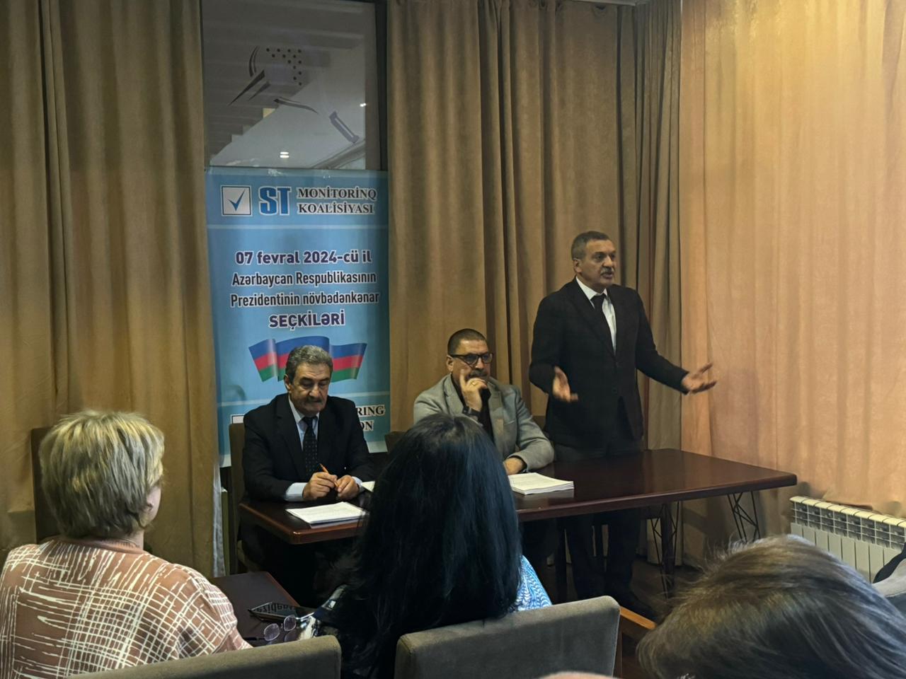 10 yanvar 2024-cü il tarixində “Sivil Toplum” Monitorinq Koalisiyası ofisində müşahidələr üçün keçiriləcək treninqlərin təlimçilərinə təlim keçirilib. Təlimdən əvvəl Koalisiyanın həmsədrləri A. M. Kərimov (“Müstəqil Hüquq Mərkəzi” İctimai Birliyinin sədi), Q. Ə. İbrahimli (“Demokratik Seçki Mərkəzi” İctimai Birliyinin sədri) və Ə. N. Abbasbəyli («Cəмiyyətin İnкişаfı Mərkəzi» Ictimаi Birliyinin sədri) iştirakçılar qarşısında çıxış edərək, “Sivil Toplum” Monitorinq Koalisiyası haqqında, 07 fevral 2024-cü il tarixdə keçiriləcək Azərbaycan Respublikasının Prezidentinin növbədənkənar seçkilərində qarşıda duran vəzifələr barədə məlumat veriblər. Q. İbrahimli Koalisiya barədə ətraflı məlumat verərək, təsisçi təşkilatları, onların rəhbərlərini iştirakçılara təqdim edib, Koalisiyanın məqsəd və məramlarını açıqlayıb. Sonra Ə. N. Abbasbəyli isə seçki mühiti, seçki prosesinin müşahidəsindən danışaraq, 07 fevral 2024-cü il tarixdə keçiriləcək Azərbaycan Respublikasının Prezidentinin növbədənkənar seçkilərində Koalisiyanın müşahidəçilərinin görəcəyi işlər barədə məlumat verib. Təlimçilərin müşahidəçilərin təlimatlandırılması prosesində əhəmiyyətini vurğulayaraq, keçirləcək təlimlərin uğuruna və faydalı olacağına inandığını bildirdi. Çıxışların ardınca A. Kərimov təlim prosesinə başlayaraq, “Müşahidəçilər üçün aparılacaq təlim modulu”nu təqdim etdi. Daha sonra Mərkəzi Seçki Komissiyasının hazırladığı “Müşahidəşilər üçün yaddaş” və seçki qanunvericiliyi barədə ətraflı məlumat verildi. Təlim ayrı-ayrı kazuslarla davam etdirilib.