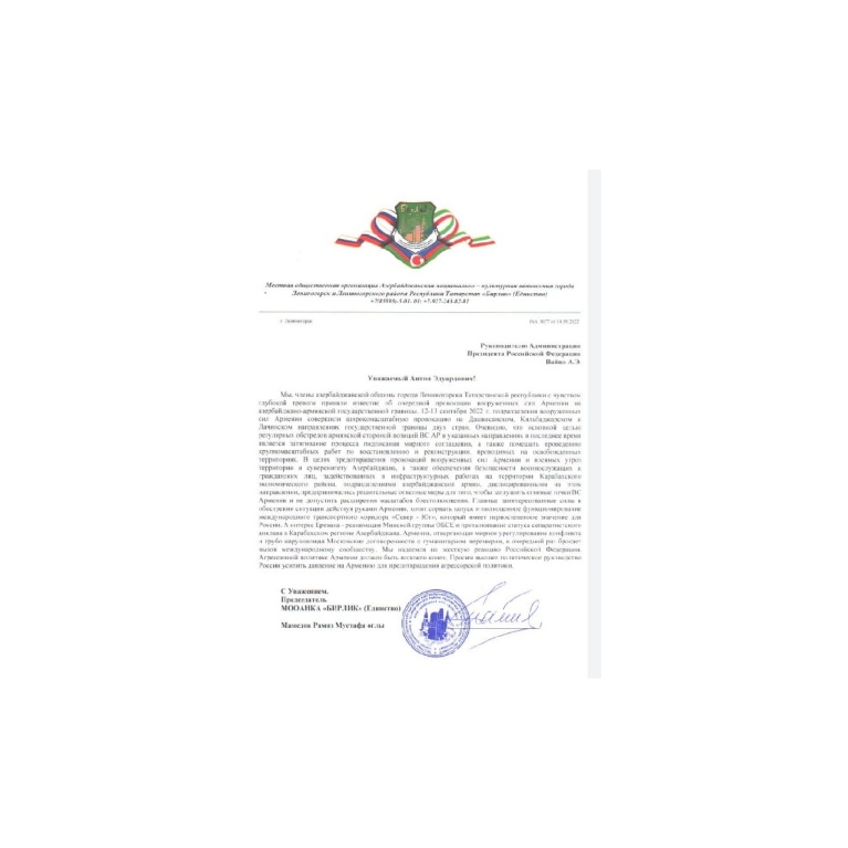 Rusiya Federasiyasının Tatarıstan Respublikasında yaşayan Azərbaycan icması ölkəmizin dövlət sərhədində Ermənistan silahlı qüvvələrinin törətdiyi genişmiqyaslı təxribatla əlaqədar Rusiya rəsmilərinə müraciət edib.Leninoqorsk şəhərinin və Leninoqorsk rayonunun Azərbaycan Milli-Mədəni Muxtariyyəti ictimai təşkilatının sədri Ramiz Məmmədovun adından Pusiya Prezidenti Administrasiyasının rəhbəri Anton Vayno, Dövlət Dumasının sədri Vyaçeslav Volodin və xarici işlər naziri Sergey Lavrova ünvanlanan müraciətdə 12 sentyabr 2022-ci il tarixində gecədən Azərbaycana qarşı başlayan hərbi təxribat Ermənistanın sülh prosesinə əngəl olmasının sübutu kimi qiymətləndirilib.Baş vermiş təxribat, qarşıdurma və itkilərə görə bütün məsuliyyətin Ermənistanın hərbi-siyasi rəhbərliyinin üzərinə düşdüyü vurğulanıb.Tatarıstanda yaşayan Azərbaycan icmasının yaranmış duruma görə dərin narahatlıq hissi keçirdiyi, üçtərəfli bəyanata və əldə olunmuş razılıqlara zidd olaraq rəsmi İrəvanın erməni silahlı birləşmələrini Azərbaycan ərazilərindən çıxarmadığı, Rusiyanın da marağında olduğu bölgədəki normallaşma və sülh prosesinə əngəl törətdiyi nəzərə çatdırılıb.“Biz Rusiya Federasiyasının sərt reaksiyasına ümid edirik. Ermənistanın təcavüzkar siyasətinə son qoyulmalıdır” tələbini irəli sürən soydaşlarımız Rusiyanın ali siyasi rəhbərliyini rəsmi İrəvanın təcavüzkar siyasətinin qarşısını almağa çağırıblar.