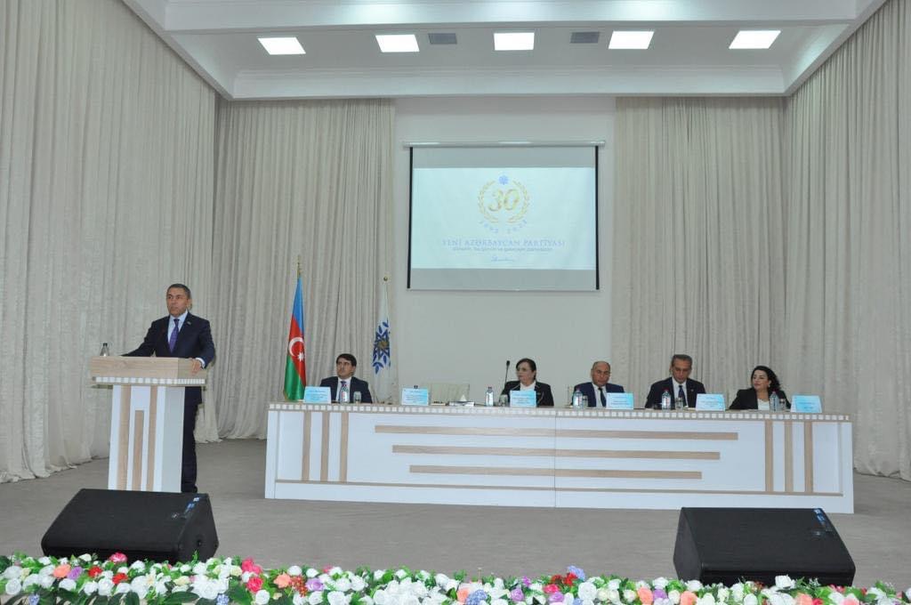Konfransda YAP İdarə Heyətinin üzvü, Milli Məclisin komitə sədri Tahir Mirkişili çıxış edərək bildirib ki, ümummilli liderimiz Heydər Əliyevin ideyaları, uzaqgörənliyi və qətiyyəti nəticəsində yaradılan YAP-ın 30 illik tarixi zəngin və şərəfli inkişaf yoludur. Azərbaycanın ən güclü və mütəşəkkil siyasi qüvvəsi olan Yeni Azərbaycan Partiyası bu gün cənab İlham Əliyevin Sədrliyi ilə xalqımızı uğurlara, qələbələrə aparan yolun bələdçisi və ən etibarl, inamlı siyasi istinadgah yeridir.