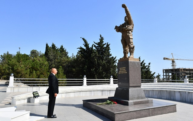 Dövlət başçısı əvvəlcə Şəhidlər xiyabanında ucaldılmış Qalib Əsgər abidəsinin və Xocalı faciəsi qurbanlarının xatirəsinə həsr olunan abidənin önünə gül dəstələri qoydu.