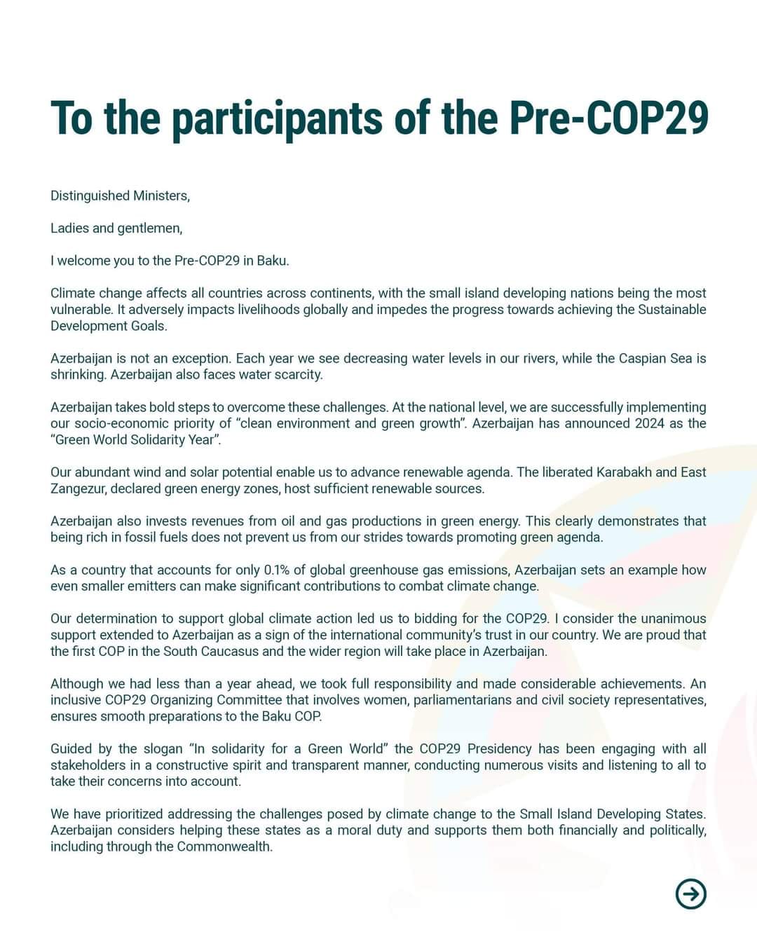Mən sizi Bakıda keçirilən Pre-COP29 tədbirində salamlayıram.