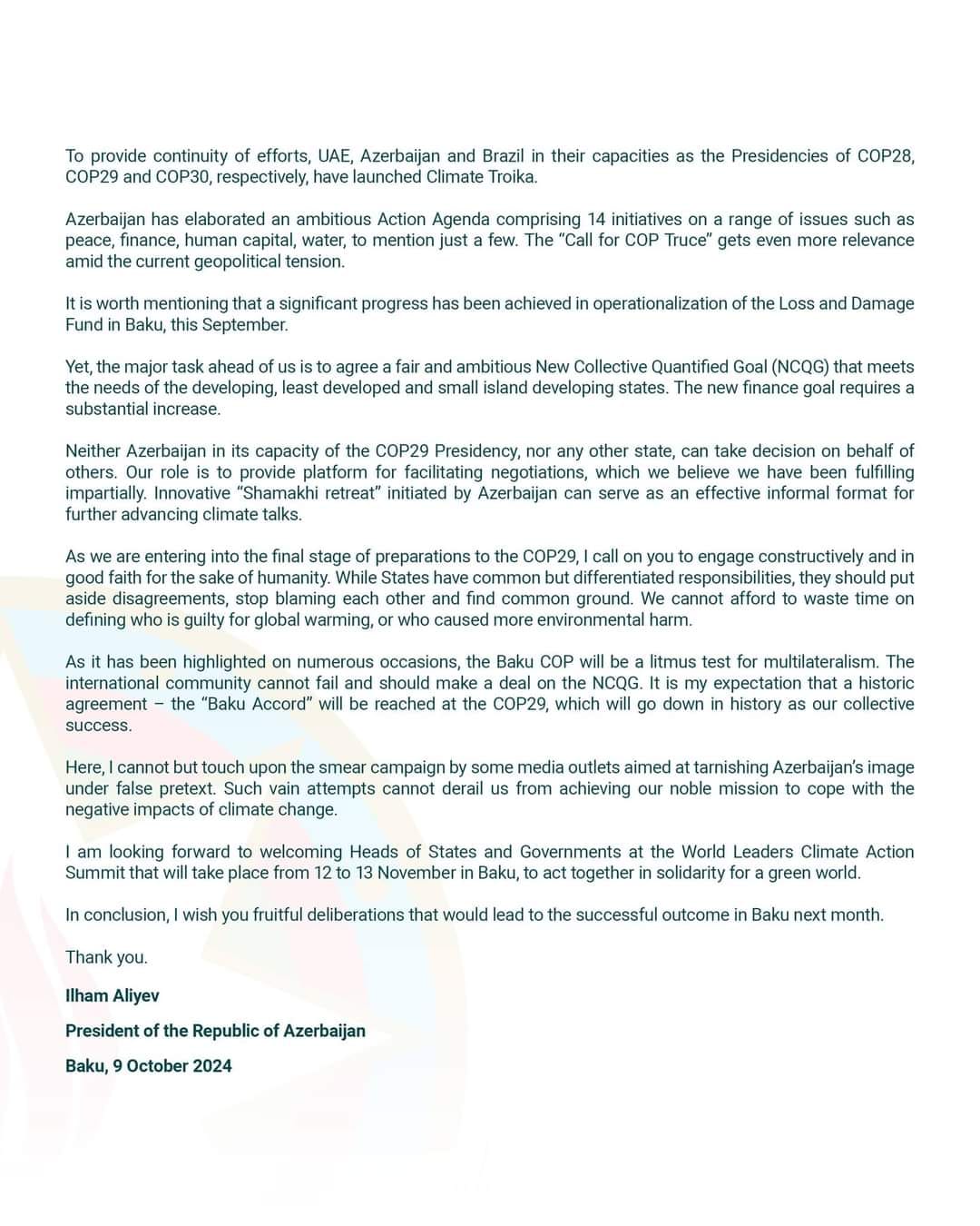 Mən yaşıl dünya naminə həmrəylik ruhunda birgə fəaliyyət göstərmək üçün noyabrın 12-dən 13-dək Bakıda keçiriləcək Dünya Liderlərinin İqlim Fəaliyyəti Sammitində dövlət və hökumət başçılarını salamlamağa şad olaram.