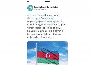 Türk Dövlətləri Təşkilatının rəsmi tviter səhifəsində Azərbaycan London şəhərindəki səfirliyinə hücumla bağlı paylaşım edilib.AZƏRTAC paylaşımı təqdim edir: “Türk Dövlətləri Təşkilatının qurucu üzvü olan Azərbaycanın Londondakı səfirliyinə radikal dini qruplar tərəfindən edilən şiddətli və qəbuledilməz hücumu qınayırıq. Bu vandalizm aktının ətraflı araşdırılması üçün çağırış edirik”.