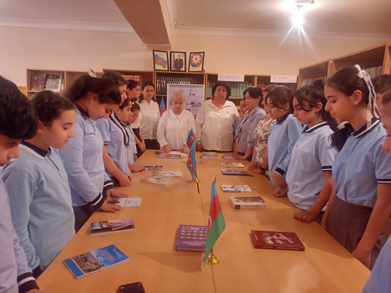 Kitabxananın Uşaq şöbəsinin baş kitabxanaçısı Xumar Babayeva və Oxuculara xidmət şöbəsinin baş kitabxanaçısı Gülnarə Cəlilova şağirdləri Dövlət Suverenliyi Günü münasibəti ilə təbrik edərək onlara yeni dərs ilində uğurlar arzuladılar.